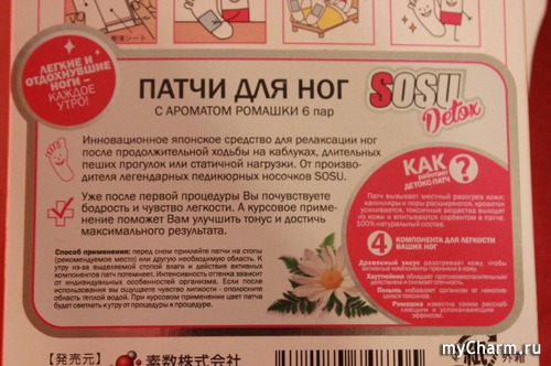 Детокс-патчи "SOSU" - очень необычный, интересный и качественный продукт. Конечно, к средствам первой косметической необходимости его не отнесешь, но хотя бы раз нужно однозначно попробовать! Легкость, релаксация ног и полное расслабление организма будет обеспечено!