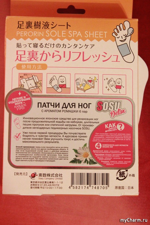 Какие существуют методы устранения "синдрома усталых и тяжелых ног"? Можно, как обычно, наносить на кожу различные охлаждающие и венотонизирующие кремы, эмульсии и т. п. А можно воспользоваться детокс-патчами от уже многим известного японского производителя педикюрных носочков "SOSU" и поверьте, эффект будет впечатляющий. Сама в этом убедилась!
