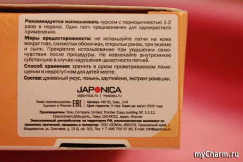 В картонной упаковке находится 6 пар патчей, их соответственно хватит на шесть полноценных применений. У меня они с ароматом ромашки, хотя в линейке имеются и другие: с запахом розы и полыни. Каждый патч упакован индивидуально в полиэтиленовый пакетик, на котором для удобства открывания присутствует небольшая насечка.