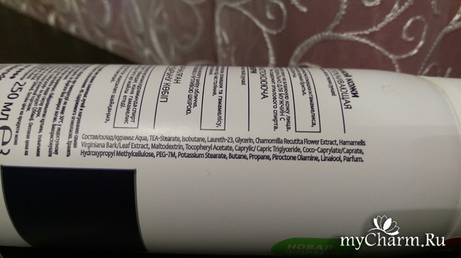 Производитель пишет на обратной стороне флакона о том, что данная пена подходит для чувствительной кожи, потому что обогащена комплексом ромашки и гамамелиса, которые защищают кожу от раздражения во время бритья, помогая добиться ультрагладкого и комфортного бритья.