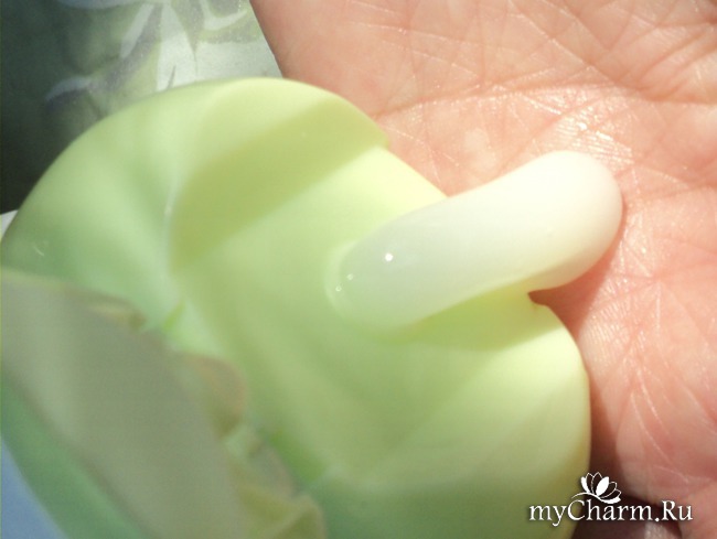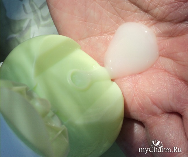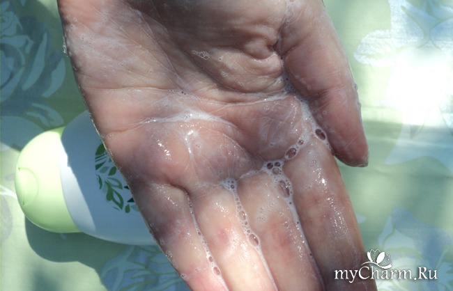 Для фото я не использовала мочалку, и вспенила этот продукт прямо в руке (понадобилось совсем немного воды). И видно, что средство сохраняет свою кремовую основу, и появляется довольно обильная пена даже без мочалки и без массирования.