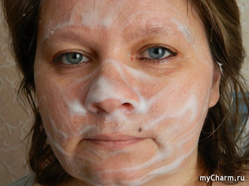 Пенкой нужно пользоваться следующим образом: нанести её на увлажнённую кожу лица (поверьте, это очень приятно!), избегая области вокруг глаз и, чуть прикасаясь к коже, равномерно распределить средство. Я делаю это лёгкими массирующими движениями, не нажимая на кожу излишне и не втирая средство.