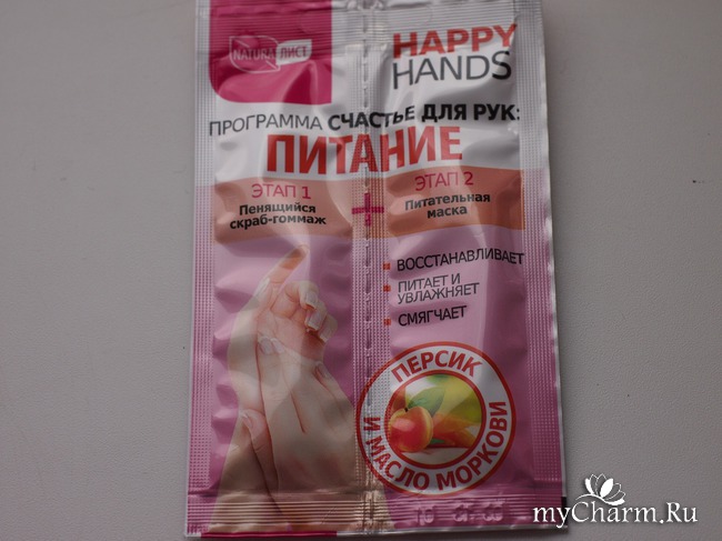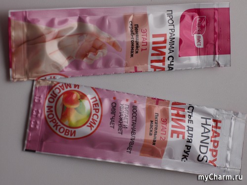 Упаковочки всех программ «Счастье для рук» от Naturalist представляют собой саше с перфорацией по середине, что делит его на два этапа, в моем случае это - пенящийся скраб-гоммаж и питательная маска.