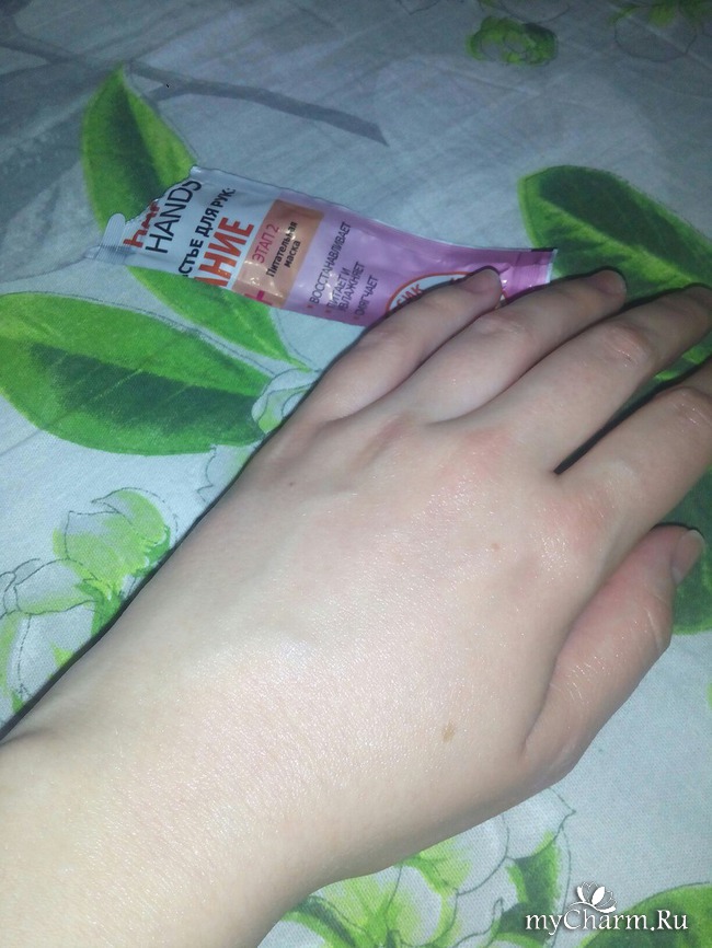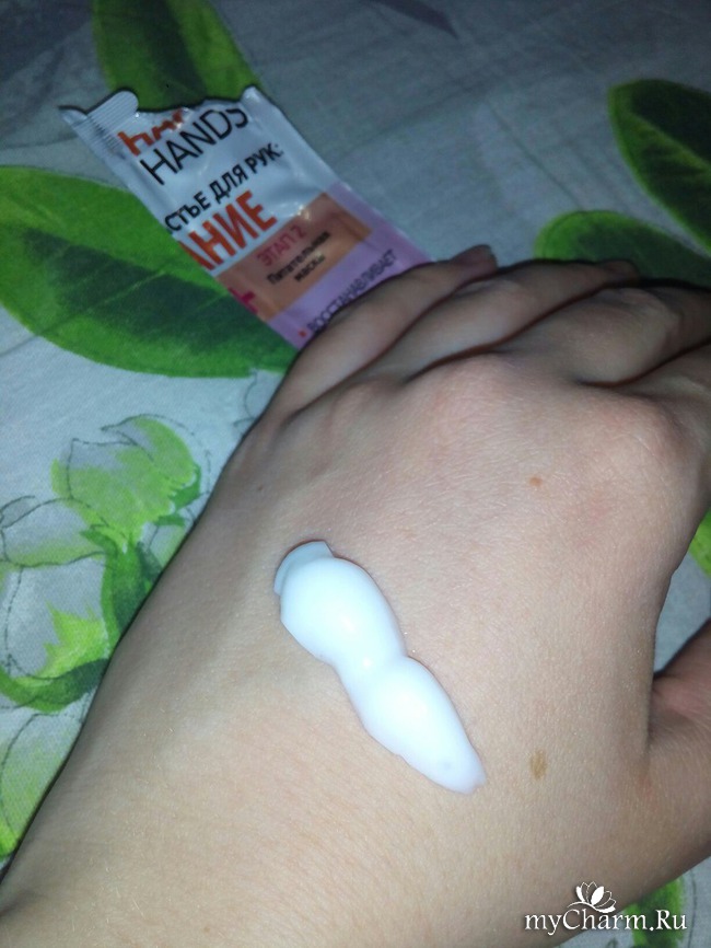 Когда ручки уже сухие, необходимо нанести содержимое второго пакетика на кожу рук. Второй, как и первый этап, я делю на 2-3 применения. Маска напоминает мне своей консистенцией жирный крем, который долго не впитывается в кожу. Даже спустя длительное время маска оставляет за собой эффект того, что она есть на коже, поэтому ее необходимо удалить с кожи. Производитель советует сделать это через 15 минут после нанесения, использовав сухую салфетку. Для усиления эффекта питания можно надеть на руки после нанесения маски полиэтиленовые перчатки и утеплить руки, например, залезть под одеяло или надеть сверху теплые варежки/перчатки.