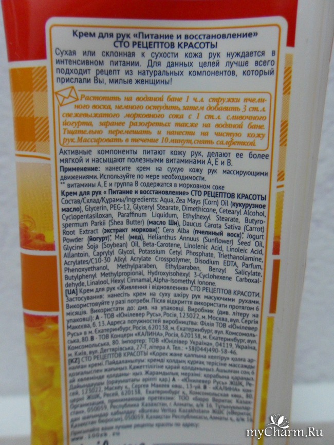 С обратной стороны тюбика как обычно приведен рецепт, присланный покупателями, на основе которого и создавался этот крем. Сама я ни разу не пробовала пользоваться этими советами, хоть они довольно интересные.