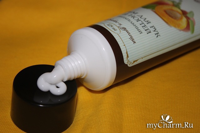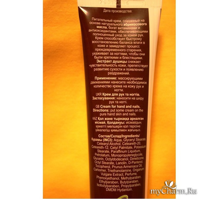 В моем случае крем для рук упакован в объемную тубу. На лицевой стороне очень гармоничны цвета «кофе с молоком» и нежно зеленые полоски. В центре- изображение абрикоса с травками. Но чуть ниже есть подробное описание, что это крем для рук и ногтей питательный «Абрикос и душица». Стоит отметить, что флакон достаточно приличный- 125 мл. Уже покупая его я понимала, что не факт, что осилю))) Хотя, срок годности в 3 года дает больше шансов. Но при этом, красноречиво говорит о щедром наборе в составе консервантов и прочих «сомнительных» элементов. Конечно, при цене чуть более 60 рублей за такой объем предъявлять претензии по поводу не 100% натуральности по меньшей мере странно. Но с другой стороны, на тюбике очень звучно и заманчиво указан слоган целой серии косметики «Медицина лечит, природа исцеляет».