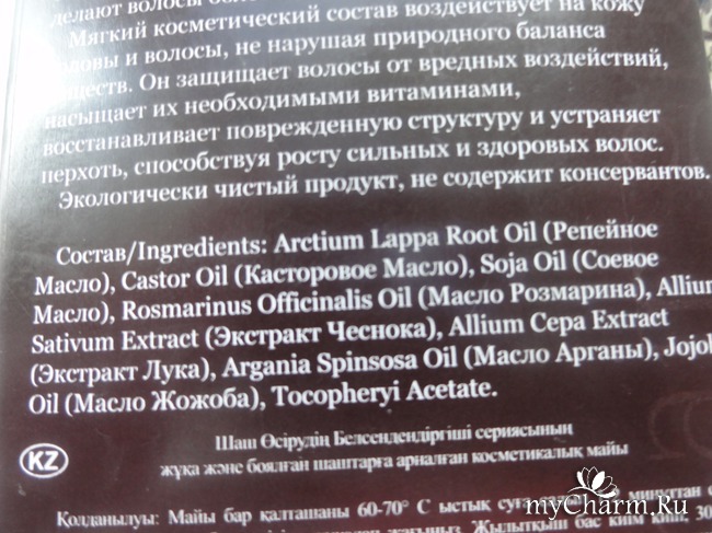 В составе масляной композиции репейное, соевое, касторовое косметические масла, эфирное масло розмарина, экстракты чеснока и лука, и в конце списка ингредиентов масло аргана и масло жожоба.