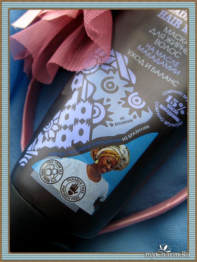 Маска для волос "живет" в пластиковой тубе, объём которой составляет 200мл. На фронтальной стороне расположена основная информация о продукте: бренд, назначение и компонент, на который делается акцент в уходе. В данном случае - это масло макадамии, содержание которого в продукте составляет 15% от общей массы средства.Картинка, выполненная в этническом стиле не только привлекает внимание, но и даёт нам дополнительную информацию о том, что масло орешка макадамия собрано вручную в Бразилии.