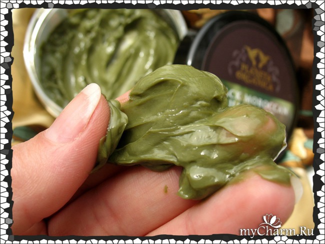 , которое находится, как мы уже поняли, в круглой пластиковой баночке с завинчивающейся крышкой. Внутри баночки - густая масса темно-оливкового цвета:Аромат, кстати сказать, очень интересный: травяной, чем-то напоминает хну, но прослеживаются еще и другие "вкусные" нотки, которые мне так и не удалось разгадать. Мне очень нравится!