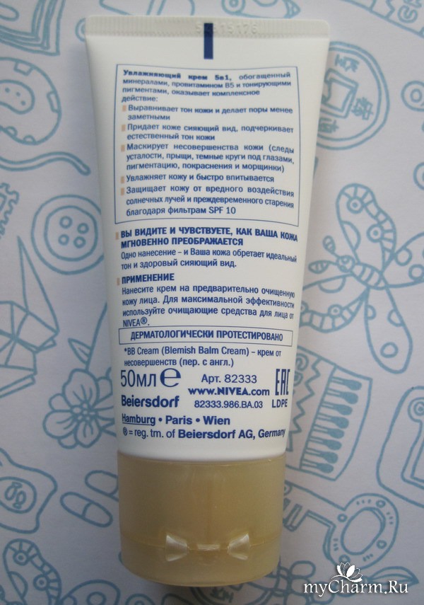 Для меня и в магазине выбрать тон проблема, а уж по интернету… ВВ-крем в этом плане хорош способностью адаптироваться под природный цвет лица. Так что у Nivea всего два тона (у корейских производителей бывает вообще один тон и точка) – это значит «посветлее» и «потемнее», то есть светлый беж и натуральный беж. Я выбрала как всегда более светлый – в силу особенностей моей кожи. Легкий и простой выбор. Цвет мне подошел (ура!).