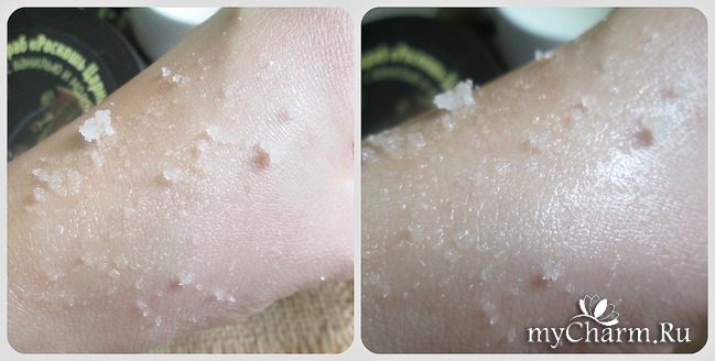 В первый раз я испробовала скраб на руке, как раз-таки на фотосессии к этому обзору. И уже тогда я отметила приятные ощущения на коже после того, как смыла средство.
