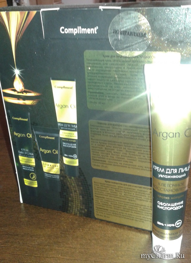 Посвятив обзоры крему для рук и век этой же линии, не хотелось бы обделять и третий крем, который предназначен для лица. Тем более, он такой же замечательный, как и остальные продукты, включенные в комплект. Так что знакомьтесь — представляю вашему вниманию увлажняющий крем для лица день + ночь Argan oil от Compliment.