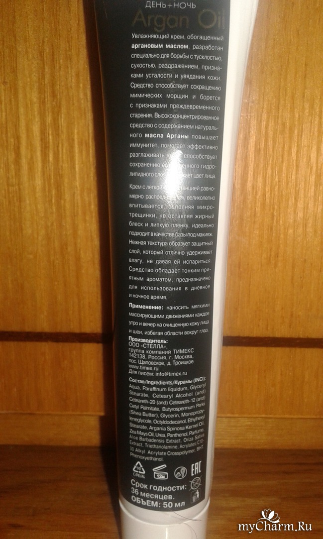 По внешнему виду крем для лица день + ночь очень схож с кремом для рук серии Argan oil. Тюбик крема такого же черно — золотистый цвета, такая же белая откручивающаяся крышка. Поначалу я даже путала средства).