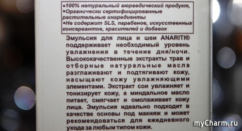 Увлажняющая эмульсия Anariti подходит для разных типов кожи. Она ухаживает за кожей лица, шеи и зоны декольте. Хочу отметить один немаловажный факт- средство обладает накопительным эффектом. Уже спустя две недели очевидно, что кожа посвежевшая и увлажненная настолько, что даже маленький перерыв в использовании не доставит дискомфорта.