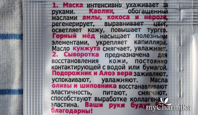 Какой же результат? Со слов мамочки, руки утром бархатистые! Этот комплекс хорошо увлажняет и питает кожу, она гладкая на ощупь. А если учесть, что каждый пакетик можно разделить на 2 применения, получится в два раза больше эффективности и заботы для кожи ваших рук!