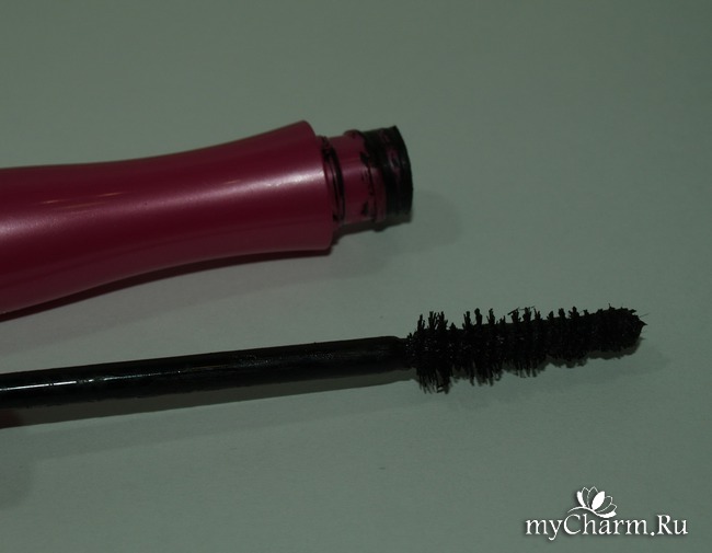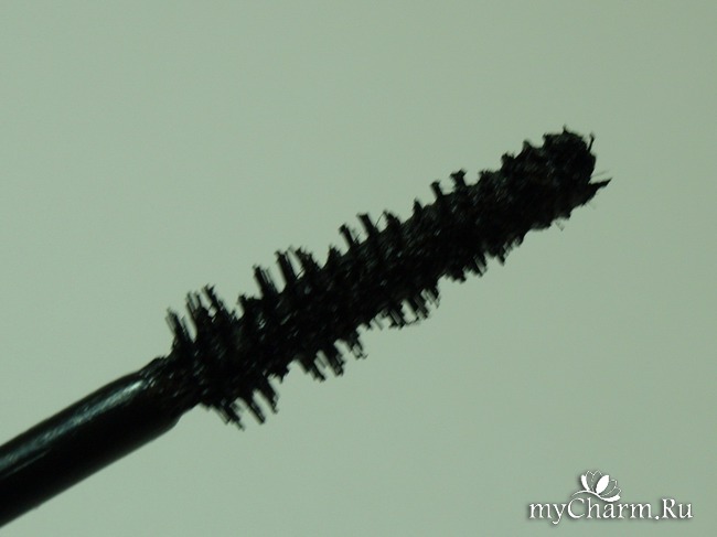 Щеточка у туши для меня показалась необычной, раньше мне такой формы в других тушах не встречалось. Ворсинки в щеточке расположены по спирали, сужаясь к краю щеточки. И как выяснилось при использовании туши, этой узкой частью очень удобно прокрашивать реснички в уголках глаз. В итоге все реснички прокрашиваются равномерно. Форма щеточки оказалась весьма удачно продумана производителем.