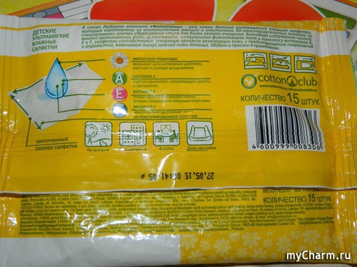 Вынимая салфетки в следующий раз, я обратила внимание, насколько хорошо рассказывается о них на упаковке: и без спирта они, и с фитоотварами, и с витаминами, и применять их можно с первых дней жизни. «Вот здорово!» - подумала я и… Правильно – сунула свой любопытный носик в раздел «состав». Интересно же, чем пропитаны салфеточки для малышей. К слову, сами салфетки изготовлены из стопроцентного хлопка (по крайней мере, так утверждает производитель).