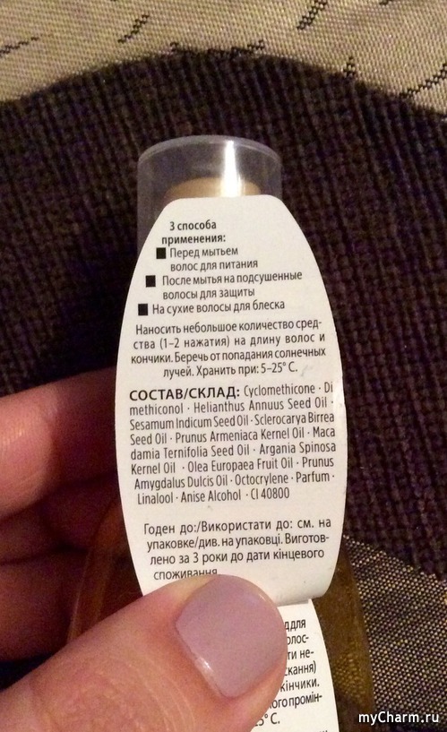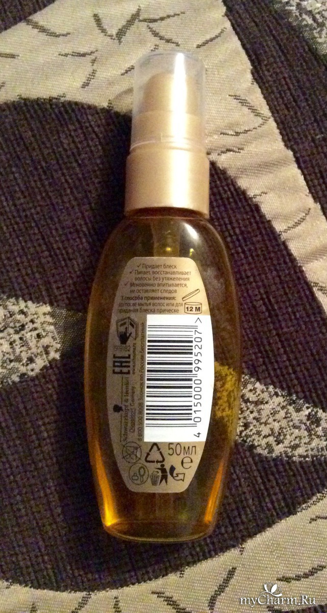 Цвет масла насыщенно желтый. На флаконе указано, что масло придаёт блеск, питает, восстанавливает волосы без утяжеления, мгновенно впитывается, не оставляет следов ( что при использовании с маслом очень важно). 3 способа применения: перед мытьем волос для питания, после мытья на подсушенные волосы для защиты, на сухие волосы для блеска. Срок годности 3 года. Состав: силикон и масла.