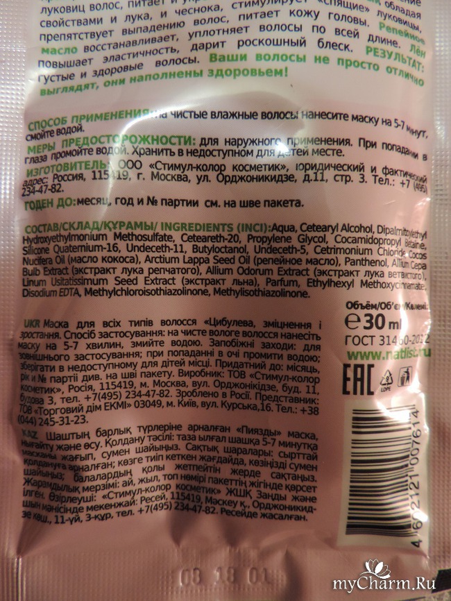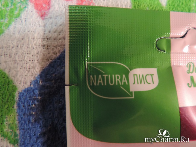 Как и предыдущие маски, эта упакована в пакетик-саше и имеет объем 30 мл. С лицевой стороны пакетика на нас смотрит очень симпатичная девушка-модель, "лицо" компании НатураЛист, которая демонстрирует свою шикарную шевелюру, тем самым призывая нас купить эти великолепные маски для домашнего использования.