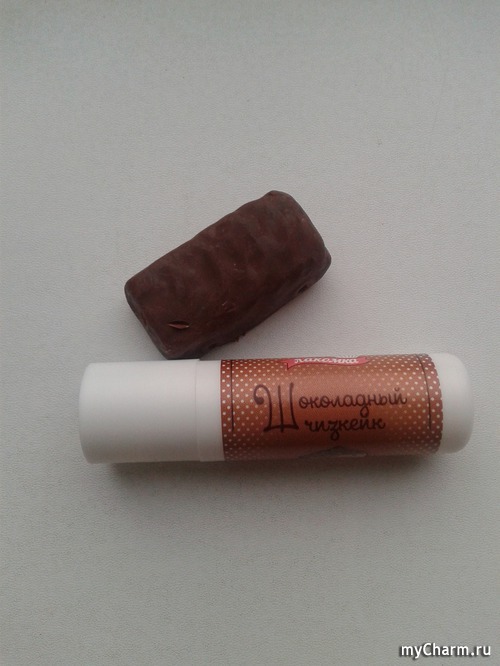 Кажется, что в стике гигиеническая помада молочно-кремового цвета, но на губах она абсолютно прозрачная. Текстура у нее нежная, жирной точно не назовешь, а скорей питательной. Помада сладко пахнет, ее аромат мне напоминает аппетитнейший шоколадный пирог с нотками ванили. Так что название производитель придумал самое что ни на есть точное - Шоколадный чизкейк...