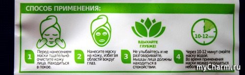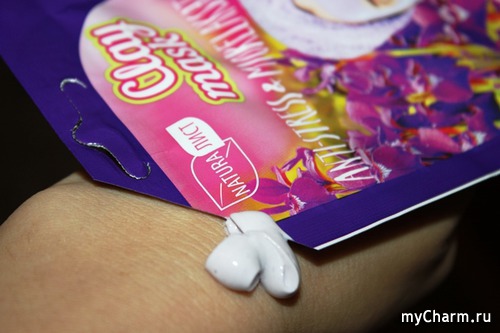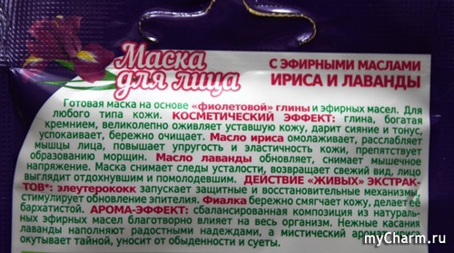 Все время отдыха следует посвятить приятным мыслям, фантазиям и грезам, тем более, что аромат к этому располагает. Сочетание сливочных и цветочных ноток гармонизирует и создает баланс в организме. Пожалуй, наиболее узнаваема в этом букете именно фиалка. Хотя, возможно, каждая из нас услышит что-то свое и сможет насладиться каждым вдохом. Спустя положенное время отправляемся смывать маску. Это невероятно просто. Даже не верится, что в составе есть глина, потому как остатки средства удаляются парой движений. И вот уже можно провести рукой по гладкой, мягкой и нежной коже лица. Уже после первой процедуры явно заметна свежесть и обновление. А впереди еще не одно подобное приятное мероприятие, ведь одного пакетика (25 мл.) хватает на 3-4 применения. Экономично и практично для милых дам.