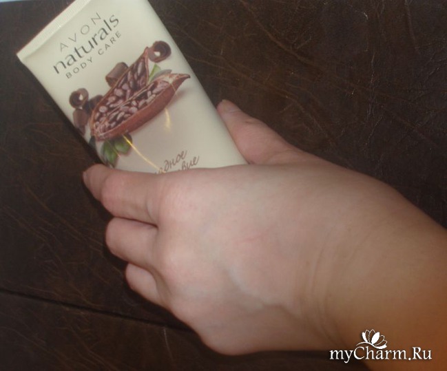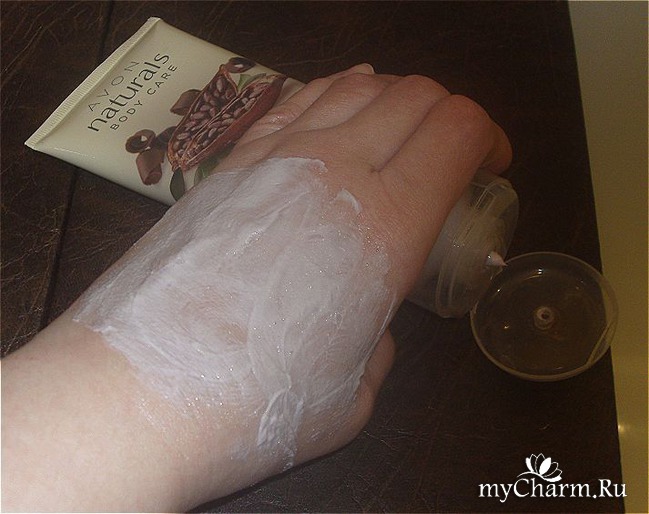 Внешний вид продукта, обещания производителя. Сам скраб заключен в бежево-золотистого цвета упаковку объемом 200 мл. Туба сделана так, чтобы стоять на крышке в перевернутом состоянии. Это опять же очень удобно при недостатке места в ванной комнате. Спереди упаковки нарисован плод дерева какао, сверху, как всегда, отчетливо видный логотип компании Avon, внизу - название скраба и его номинальный объем. На оборотной стороне сразу на нескольких языках, в том числе и на русском, размещена информация о самом скрабе, результатах и способе его применения.