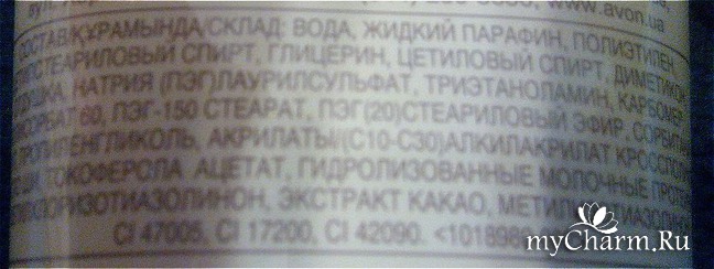 Состав продукта. Состав данного скраба, конечно, мог быть и понатуральнее. Если бы стоил дороже! В нем, как это свойственно для большинства продукции компании Avon, присутствуют и химические составляющие, но, натуральные компоненты тоже имеются. Здесь это экстракт какао и гидролизованные молочные протеины. А, впрочем, смотрите сами!