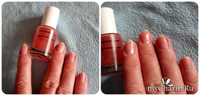 Во флаконе бальзам имеет персиковый цвет. А при нанесении на ноготь выглядит абсолютно прозрачным. Обратите внимание, на первом фото просто ногти, а на втором уже с нанесенным на них бальзамом.
