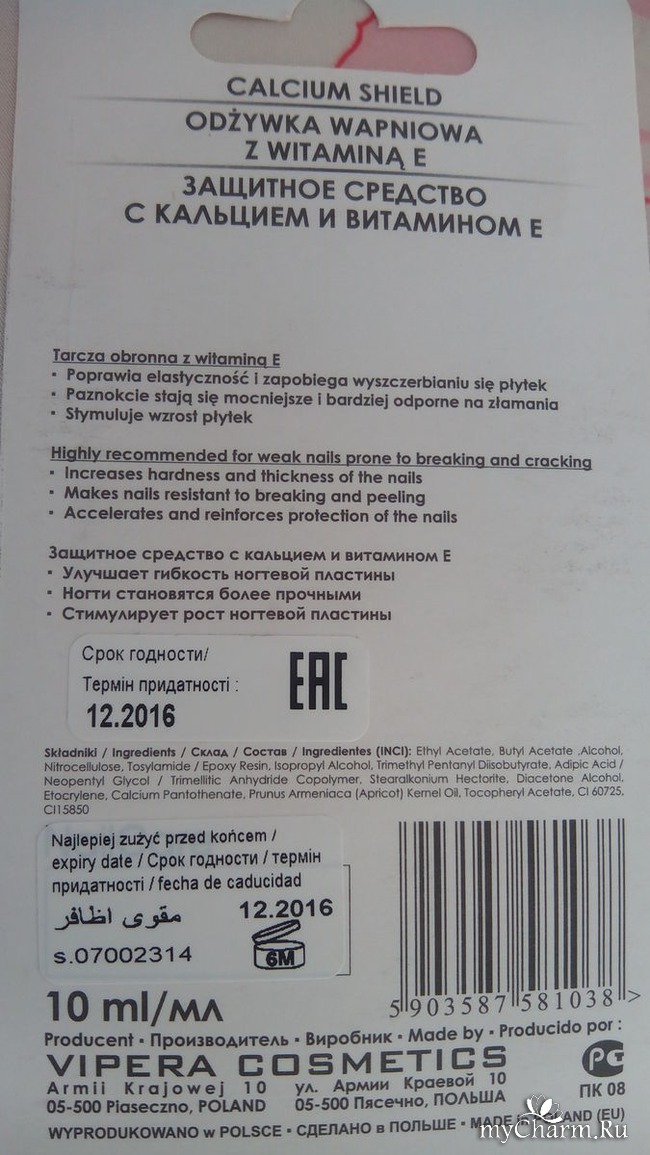 С обратной стороны есть информация и по-русски. Откуда можно узнать, что это защитное средство с кальцием и витамином Е придает ногтевой пластине гибкость, делает ее крепче, и стимулирует рост ногтей.