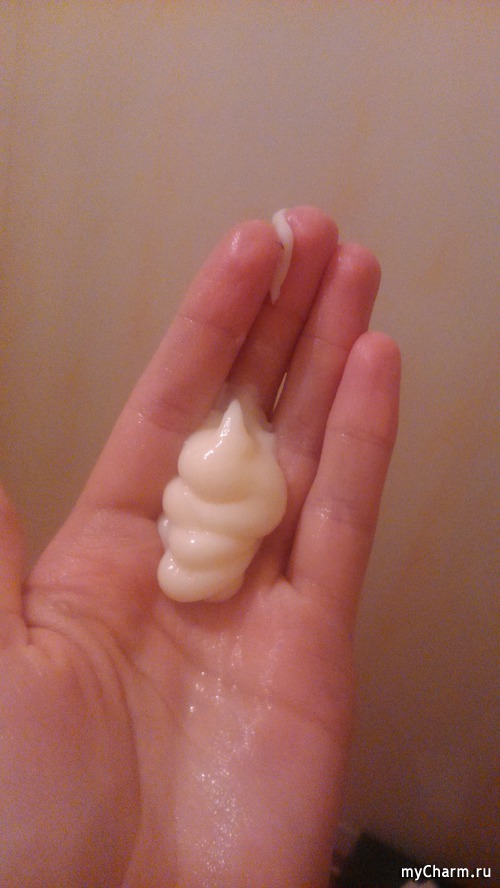 Кондиционер белого цвета с еле заметным желтым оттенком, довольно-таки густой.
