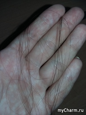 Как видно, после использования средства волосы очень спутались, и расчесать их мне стоит не малых усилий. Во- вторых, выпадение волос не прекратилось и даже не уменьшилось. На моей руке вы видите волосы, которые выпадают у меня за один раз только от того, что я провела рукой по всей длине. Если сосчитать их количество за день, боюсь, получится цифра всё так же далекая от нормы... Хотя тут, как и в борьбе с целлюлитом, наивно полагать, что шампунь сможет решить проблему, которая кроется в самом организме.