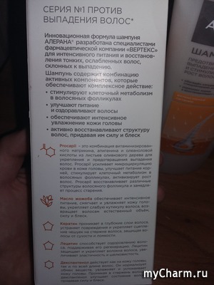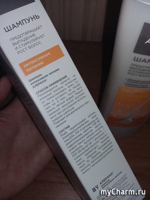 Как правило, человек теряет от 50 до 100 волос в день, и это считается нормой. С недавнего времени у меня стало выпадать в два, а то и в три раза больше положенного. Наверное, многие женщины после родов сталкиваются с такой проблемой. Выпадение волос в этот период, в основном, носит временный характер, и является следствием гормонального сбоя или нехватки витаминов. Так как курс витаминов мной был пропит, я решила сделать акцент на питание и восстановление самого стержня волос. Вот тут-то я и вспомнила о серии средств Алерана, на которую давненько положила глаз, заприметив в аптеке, уж слишком многообещающим было описание шампуня. Да, и слышала о нем хвалебные отзывы. Цена вопроса - 375 руб. Из всего многообразия линейки шампуней Алерана, я выбрала " Интенсивное питание", дабы он помог укрепить корни и восстановить структуру волос. Таким образом, у меня в ванной появился новый флакон с почти прозрачной жидкостью, на который я тут же возложила большие надежды.