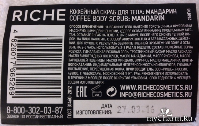 Итак, о чем же пойдет сегодня речь? Представляю вашему вниманию натуральный скраб торговой марки Riche (Рише) - кофейный скраб Мандарин.
