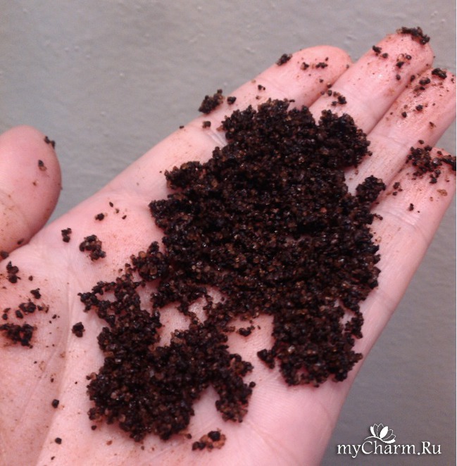 Открыв упаковку впервые, моя ванная сразу же наполнилась умопомрачительным запахом кофе. Ох, какой же это аромат, трудно передать словами. У меня и раньше были кофейные скрабы, но такой аппетитный аромат я почувствовала впервые. Это нежный, и в тоже время яркий и бодрящий аромат настоящего свежего кофе, который переплетается с нотками эфирного масла мандарина. Аромат просто сказка, получаешь незабываемое удовольствие и релакс, вдыхая этот аромат.