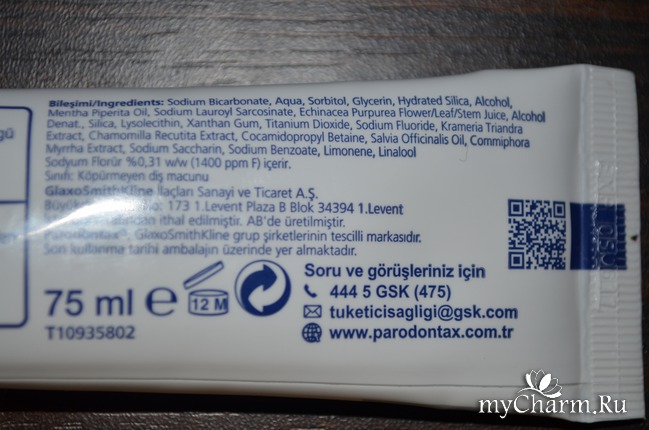 Что нам обещает производитель? Зубная паста Парадонтакс ''Бережное отбеливание'' эффективно борется с кровоточивостью дёсен, гингивитом и парадонтитом. Это утверждение взято из российских источников. На моей турецкой зубной пасте скромно написано: Зубная паста Парадонтакс ''Бережное отбеливание'' - Специалист в области ухода за полостью рта. И с тем, и с другим утверждением полностью согласна. После применения этой пасты мои красные дёсны порозовели, и значительно уменьшились их болезненность и кровоточивость.