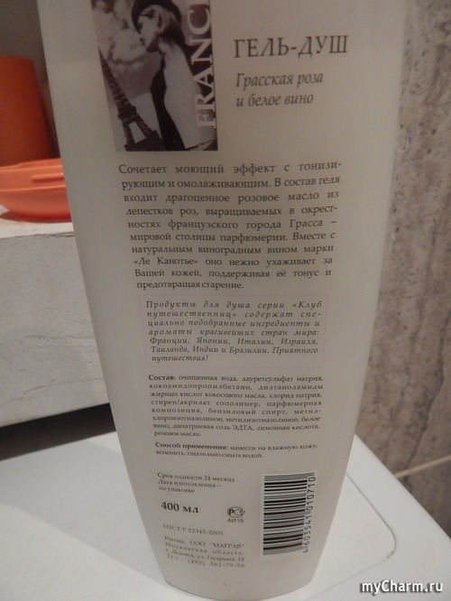 Гель из серии «Клуб путешественниц», объединение продуктов под такой серией производитель объясняет содержащимися в составе ингредиентами и ароматами, собранными почти со всего мира, в частности с таких стран, как Франция, Япония, Италия, Израиль, Тайланд, Индия, Бразилия.