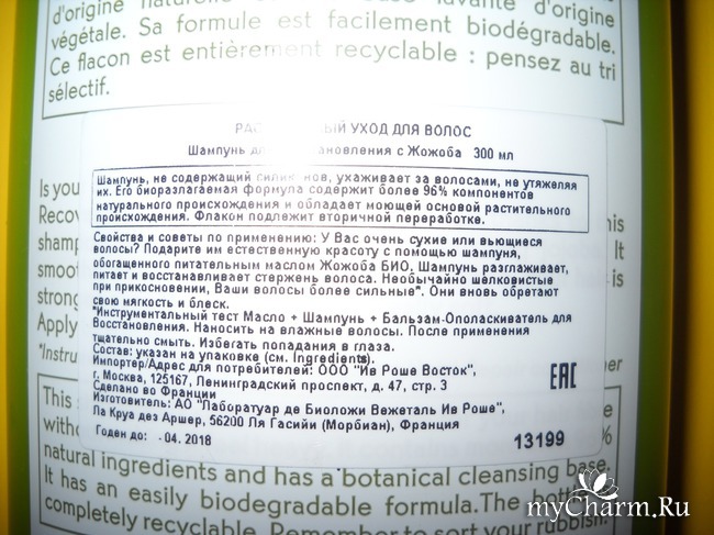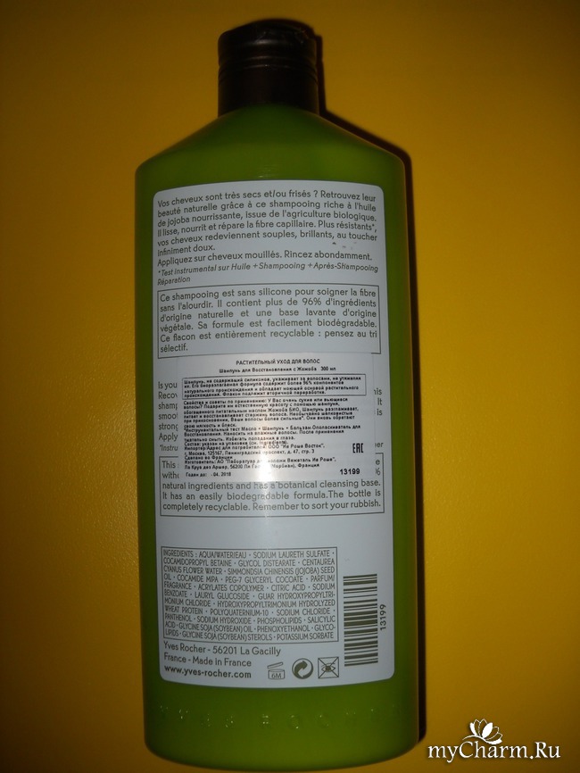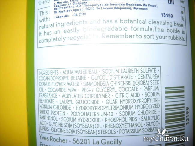 Так же, как и упомянутый мной ранее шампунь для объема с мальвой, шампунь с жожоба наделен сверхсовременной биоразлагаемой формулой, включающей в себя более 98 процентов натуральных ингредиентов и характеризующейся растительной моющей основой. Без растительных компонентов Ив Роше – не Ив Роше!