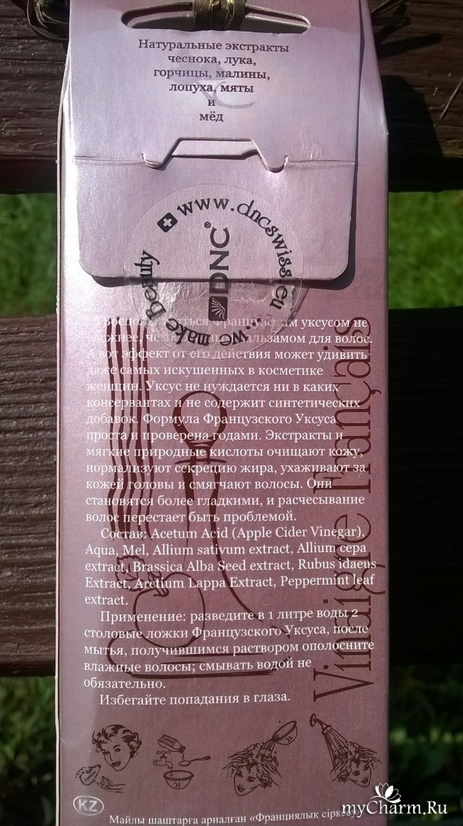 Кажется, в наше время рецепты прошлых веков начинают возвращаться и воплощаться в продукции косметических брендов, заявленных как натуральные. DNC является лидером среди них. Создавая свой продукт для ополаскивания волос, производитель в полной мере позаботился об его составе. Целых 100 мл настоящего французского яблочного уксуса с натуральными экстрактами чеснока, горчицы, лука, малины, мяты, лопуха и меда.
