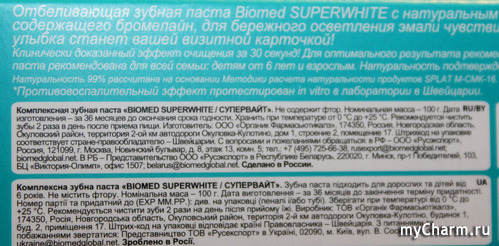 Почему Biomed Superwhite – это правильная зубная паста? Она не содержит парабенов, синтетических красителей и ароматизаторов, и что важно конкретно для меня – фтора. Она хорошо очищает. Рекомендована для всей семьи, начиная с детей от 6 лет. Плюс это не разорительный для семейного бюджета продукт. Обычная цена в магазине, куда я хожу за бытовой химией, - 92 рубля. Я беру, когда они делают скидку на эту категория товара, по 68-70 рублей. Объем тюбика - 100 гр. Нам вдвоём с мужем хватает тюбика на месяц. Ещё один немаловажный фактор - добротная упаковка и очень плотная фольга, крепко закрывающая «вход»в тюбик и обеспечивающая гигиеничность товара.