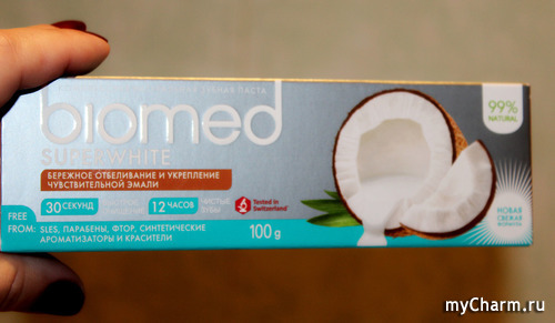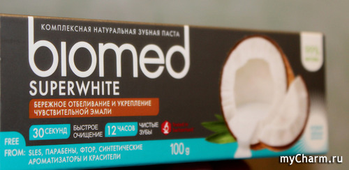 Что мне поможет в достижении цели? Я делаю ставку на комплексную натуральную зубную пасту Biomed Superwhite с натуральным кокосовым маслом и экстрактом ананаса.