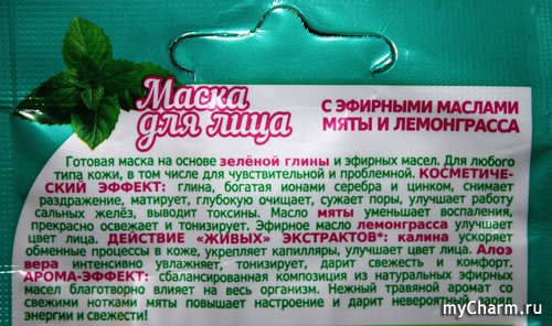 О свежести и удовольствии во время применения вам намекает оформление маски. Яркие сочные зеленые цвета раскрывшихся листьев мяты вызволяют из нашей памяти такие родные и любимые вкусные нотки. Уставшей коже это только на пользу.