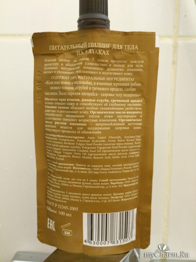 Содержит 100% натуральные ингредиентыНежный пилинг на основе 5 злаков превратит каждую процедуру в абсолютное удовольствие и пользу для тела. Активные натуральные компоненты деликатно очищают, питают и увлажняют, разглаживают и подтягивают кожу. Молотые зерна ячменя, ржаные отруби, гречневый продел нежно очищают кожу и способствуют её глубокому питанию. Овсяное толокно обладает особым увлажняющим свойством, смягчает и разглаживает кожу. Органическое масло амаранта способствует насыщению клеток кожи кислородом и существенно замедляет возрастные изменения. Органическое масло ростков пшеницы – непревзойденный источник полезных веществ для поддержания здоровья кожи, стимулирует процессы её обновления.
