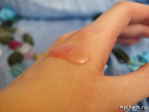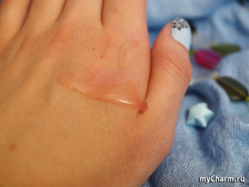 Жидкий, полупрозрачный, светлого красно-малинового цвета, можно сказать, карамельный оттенок. Смотрится приятно. Также в геле наблюдается небольшое количество перламутра. Я люблю более густые текстуры, но это уже лично мои предпочтения. В целом, претензий нет.