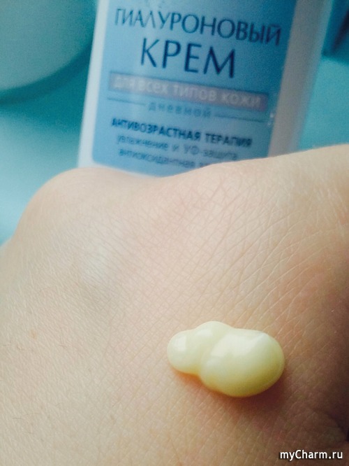 Итак, вернёмся непосредственно к рассматриваемому продукту. У крема из гиалуроновой серии легкая, невесомая текстура светло-желтого цвета.