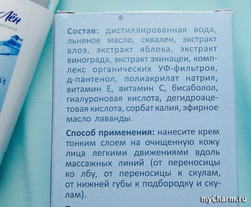 Особое внимание хочется уделить льняному маслу. Как видно, этот компонент стоит в начале списка, и это означает, что концентрация его достаточно высока. Богатое полиненасыщенными жирными кислотами, это масло восстанавливает защитные функции кожи. Остальные составляющие крема так же призваны для сохранения красоты и молодости нашей кожи. Растительные экстракты алое, яблока, винограда и эхинацеи тонизируют, увлажняют и питают кожу, повышают её защитные свойства, обеспечивая защиту от неблагоприятных внешних факторов ( мороз, сильный ветер, солнечные лучи). Витамины Е и С, входящие в состав гиалуронового крема необходимы для поддержания эластичности кожи и сохранения здорового цвета лица. Ну а хорошо известная всем гиалуроновая кислота помогает удержать влагу в верхних слоях эпидермиса. По-моему, замечательный состав, работающий по всем направлениям. Такой уход необходим коже в любое время года!