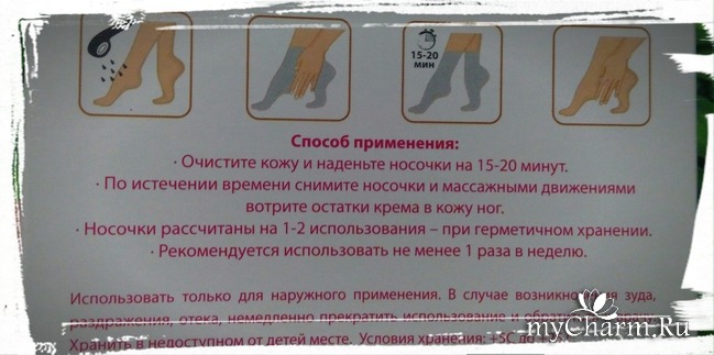 Большой бонус от производителя: носочки НЕ одноразовые. Указано, что упаковкой можно пользоваться 1-2 раза, но это конечно самый минимум прописан: мне с лёгкостью упаковки хватило на 3 раза. По сути, пока крем (белого цвета, кремовой текстуры и приятного нежного цветочного аромата) не впитался весь, можно пользоваться. Естественно, что после каждого применения, носочки нужно герметично закрывать. Я для этого заклёпку для пакетов использую.