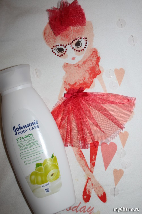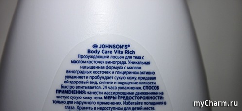 Пробуждающий лосьон Johnson’s Body Care Vita-Rich содержит масло косточек винограда. Этот полезный компонент давно известен в косметологии своим высоким содержанием целого комплекса витаминов, жирных кислот, микро- и макроэлементов, флавоноидов и пр., что заслуженно дало ему второе имя «гормон молодости». Безусловно, надеяться на высокое его содержание в лосьоне не следует, но даже незначительное присутствие определенно даст результат. Увлажнение обещано производителем на 24 часа!