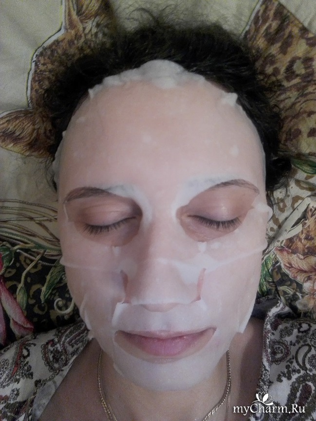 Выкройка данной маски мне как раз очень подошла. Обратила на это внимание, потому что перед применением прочитала отзывы, не все остались довольны кроем. Все прорези были на своих местах, у меня немного на щеках ткань собралась, наверное, надо щечки попухлее. А так - прямо по контуру лица отлично легла. Так незаметно пролетели 15 минут, и пришло время снять маску.
