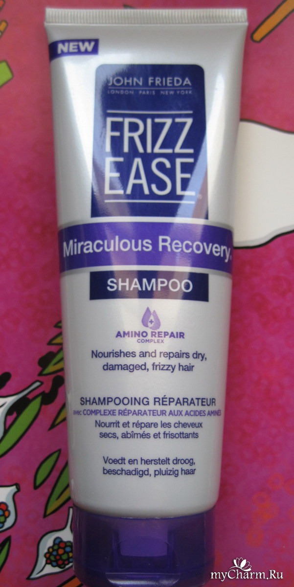 Лучший шампунь, который я нашла у Джона Фриды, - это шампунь для укрепления волос Miraculous Recovery линейки Frizz Ease. Основное назначение этого средства (помимо, конечно очищения) – это восстановление структуры и внешнего вида сухих и поврежденных волос. Что касается поврежденности, то хоть я и не крашу волосы и не делаю химических завивок, однако нередко сушу голову феном. Погодные факторы, конечно, тоже сказываются. Впрочем, и нехватка каких-то витаминов и минералов наверняка дает о себе знать. Кто может похвастаться абсолютно здоровыми волосами, которые даже не секутся?.. Так что укрепление волос – это то, что нужно почти каждой женщине. И я не исключение.
