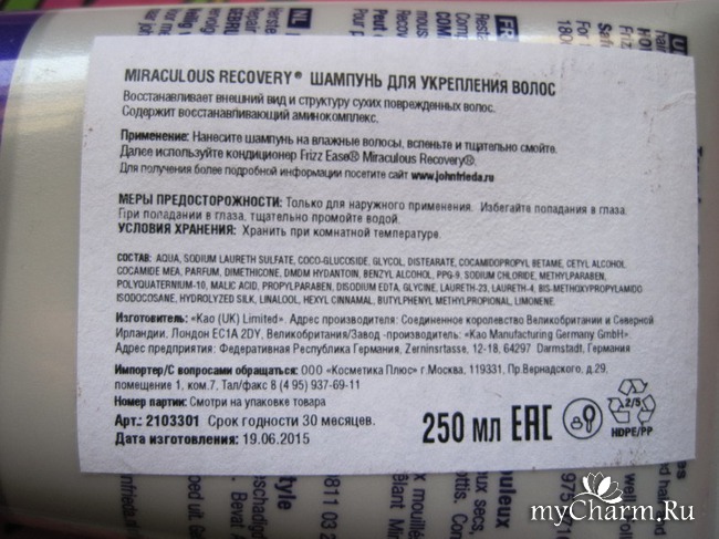 Шампунь для укрепления волос Miraculous Recovery серии Frizz Ease бренда John Frieda представлен в объеме 250 мл по цене шесть сотен с копейками рублей. Тюбик – традиционный для шампуней и кондиционеров John Frieda крышечкой вниз. Шампунь вытекает из него легко – трясти банку не приходится. Колпачки довольно крепкие. Сколько ни использовала продукцию John Frieda – ни один (ттт) не сломался.